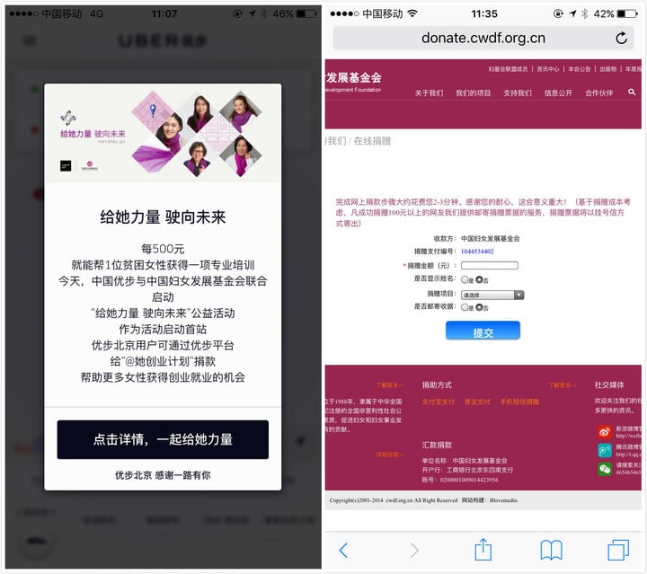 此外,妇女节当天,优步还将鼓励乘客通过 app 进入“@她创业计划“的专项捐赠页面,进行在线捐款。