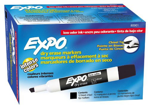 Expo 低臭黑色白板笔。比起 Sharpies 马克笔,我更喜欢这个,因为它用途更广、没什么气味,而且……可以擦掉。