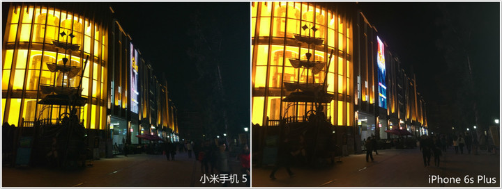 和我们之前的测试结果结论一致,光照条件好的情况下,小米 5 白平衡表现比较稳定,整体略偏绿。在夜景拍摄中,小米 5 表现就差点意思了,相对于 iPhone 6s Plus,画面的涂抹感略重,不过仍旧属于较为不错的范畴。而在饭前验毒的环节,小米手机 5 和 iPhone 6s Plus 的区别主要在于风格取向,小米偏冷一点,iPhone 偏暖一点。