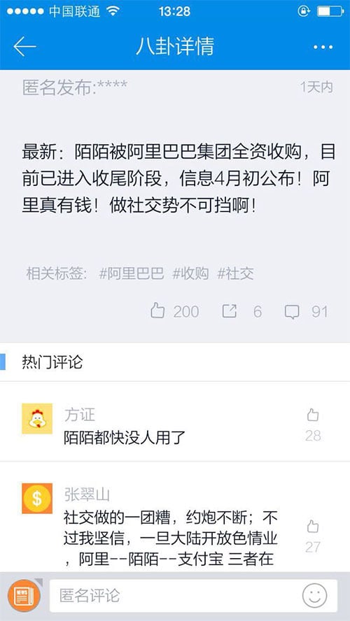 不过目前并不能确定这条匿名发布的信息(陌陌被收购)的真伪,一些资本界的媒体也撰文称,“已联系陌陌内部,但并没得到回应。”