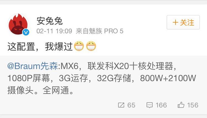 虽然 PRO 6 发布时间仍不确定,但魅族的上半年旗舰 MX6 应该离正式发布不远了。安兔兔官方微博曾经透露,即将发布的魅族新机将会首发搭载联发科 Helio X20 十核处理器。同时这款手机还会配备 1080p 屏幕、3GB RAM、32GB ROM 并搭载基于 Android 6.0 的 Flyme 系统、前置摄像头 800 万像素、后置摄像头 2070 万像素。但现在除了机器参数,还没有真机外观的曝光。