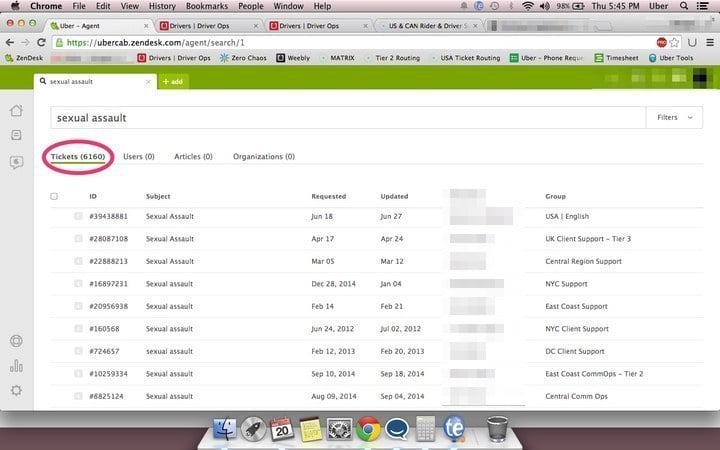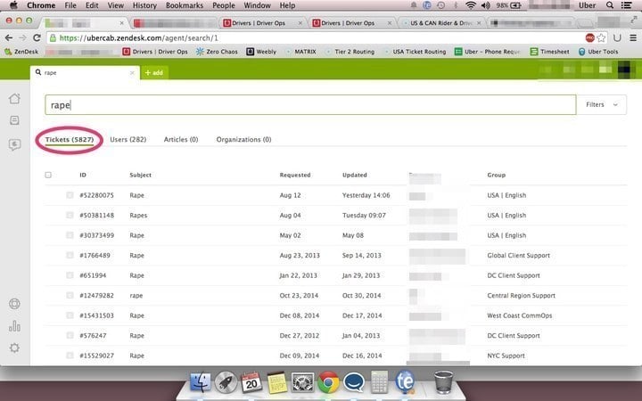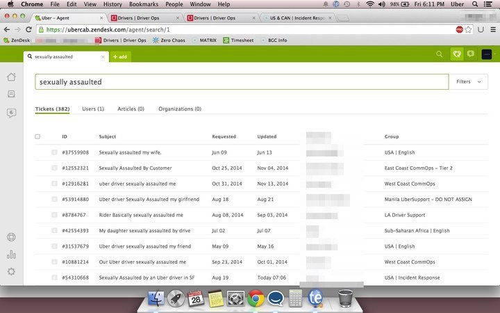 Uber 的客服基于美国 Zendesk 的系统,几乎所有用户投诉的处理都通过邮件形式解决,可是在 BuzzFeed 发布的截图中,我们并没有看见任何一封邮件的详细内容,只有搜索“Sexually Assaulted”的时候看见了用户的具体投诉: