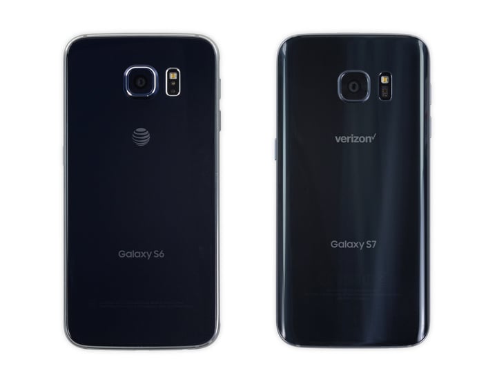 嗯,从正面来判断这个问题似乎有些困难。翻个面就好判断了,S6 的后盖玻璃相对平整,S7 的后盖则像 S6 edge 正面,两侧也是曲面。