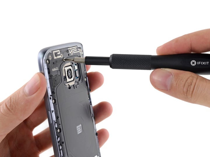 去年,iFixit 发现黏合剂是白色的,而今年 S7 上的黏合剂是黑色的。于是,iFixit 猜测这种改变是为了提高防水能力。不过 iFixit 也不忘打趣:这可能就是为了颜色匹配而已。后盖下面还有一层背板,可以通过拧螺丝的方式拆掉这一层背板。