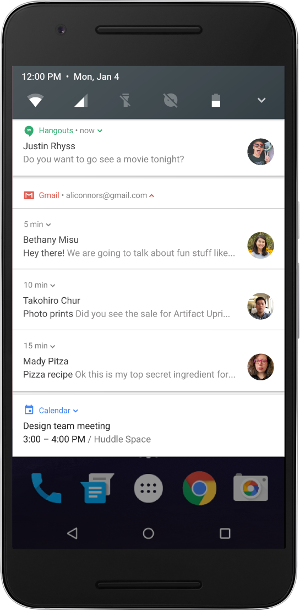 Bundled notifications:在 Android N 之下,用户可以把来自同一个 app 的通知分组放在一起。