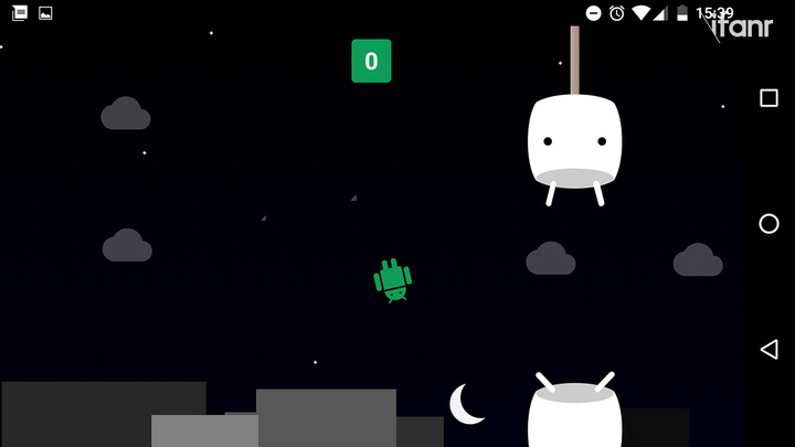 这个版本的 Android 也有属于自己的小彩蛋。在设置的关于本机一栏里,连续点击版本号就会弹出一个大大的字母图形 N,长按这个 N 就会进入一个小游戏,游戏和两年前红极一时 Flappy Bird 极其相像,但是难度却比那个难倒了无数人的 Flappy Bird 还要高得多,正常情况下我们是不可能过得了第一个开口,一度让我们怀疑这个游戏根本就没有设计后面的关卡。最终爱范儿的 CTO 同学还是成功地打(蒙)过了第一个开口, 不过过完也马上挂掉。
