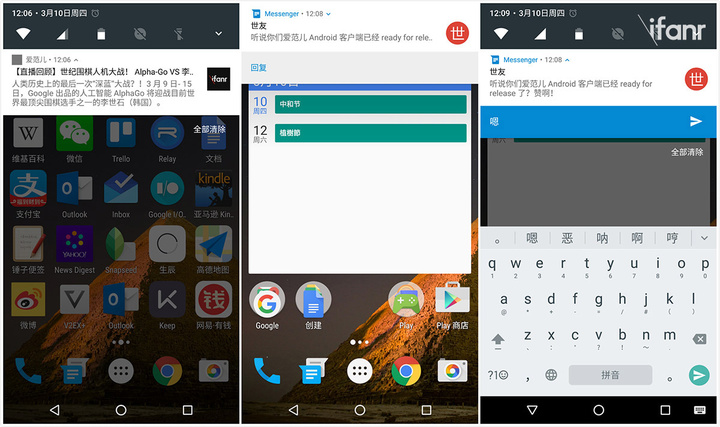 在 Android N 的通知栏里,拖拽消息条目可以查看更多消息。此外,Android N 开放了新接口,可以在顶栏的消息推送通知中直接进行回复,不用再为了回个 “OK” 专门点进程序回复再跳出来,是个相当实用的特性。苹果在 iOS 8 的时候就已经加入类似功能,Android 如今也终于跟进。