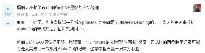 知乎上比赛前的预测讨论中,有一位 Google 工程师“杨帆”更是直接发表意见: