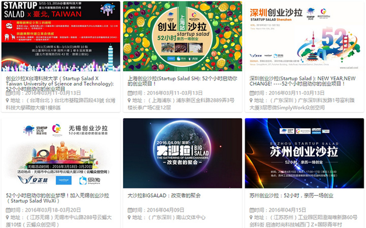 与 52 小时对应的是另外一个数字,2015 年创业沙拉一共在 3 个国家的 27 个城市举办了 46 场活动,一年里基本每周都有活动。