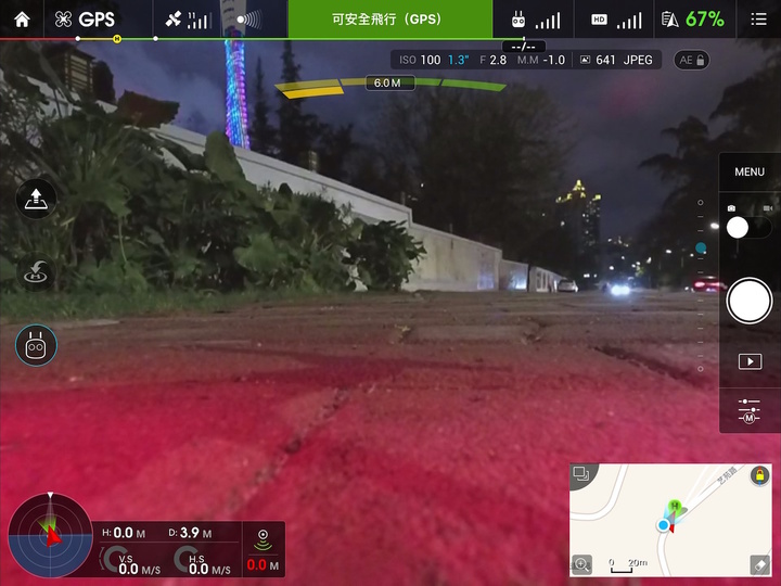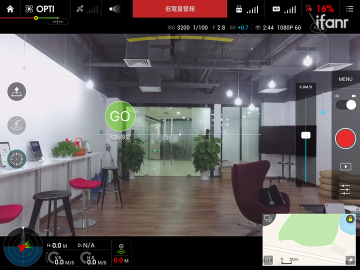 运动模式也突显了大疆对自己技术的信心:因为其实不少无人机经过调参后,都可以在没 GPS 的管制下狂飙 20m/s 或以上,但目前就只有精灵 4 才可以在 GPS 模式下,进行如此高速度的飞行。虽然精灵 4 在运动模式下不能使用计算机视觉的功能,但它仍然可以进行 GPS 自稳(下图),而且也可以透过 GPS 一键回航,这就不怕在乱飞时飞丢了无人机。