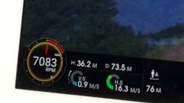 在操控方面,精灵 4 的手感比起精灵 3 较温柔,更容易进行细微而高精度的操作,但代价是灵活性下降。不过,要挑剔它不够灵活的话,只要我们把遥控拨入运动模式 (Sport mode),精灵 4 的反应就会变得极为灵敏,而且极速可以达 20m/s (72km/h)。最有趣的是:运动模式里设有一个像汽车的马达转速表,而且也像汽车一样的设有红区(防止马达过热而强制降速),藉着转速表监视马达状态。我们在测试时只小试一下运动模式,马达转速亦达到每分钟 7000 转以上的红区时,极速能高达 16.3m/s (58.7km/h)(下图,危险动作,请注意安全),要去到 20m/s,似乎需要一些技巧。