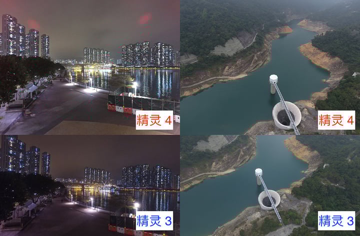根据大疆的说法,精灵 4 的相机镜头在畸变上比精灵 3 降低了36%,色差降低了56%。但实际如何?下面视频对比能,看到两代精灵的总体拍摄质素分别并不太大,不过细节上的确是有所改进,以往偏蓝的情况已有改善,而夜拍亦有若干程度上的进步。