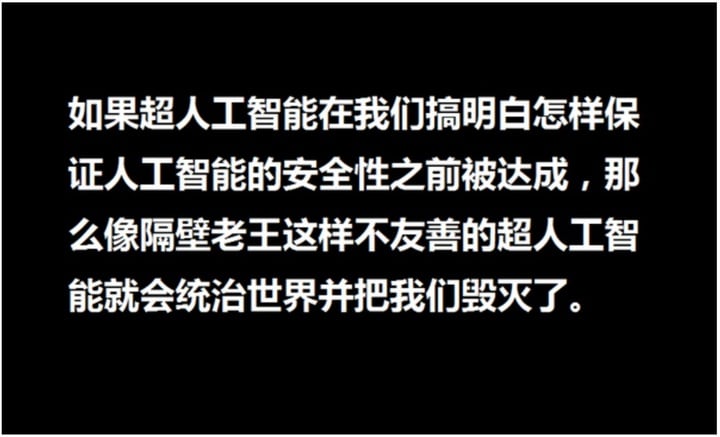 但是如果事情走向了另一面——如果超人工智能在我们搞明白怎样保证人工智能的安全性之前被达成,那么像隔壁老王这样不友善的超人工智能就会统治世界并把我们毁灭了。