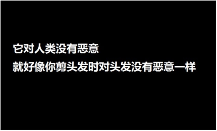 当隔壁老王达到了一定程度的智能后,它会意识到如果不自保就没有办法写卡片,所以去除对它生存的威胁就变成了它的手段目标。它聪明的知道人类可以摧毁它、肢解它、甚至修改它的代码(这会改变它的目标,而这对于它的最终目标的威胁其实和被摧毁是一样的)。这时候它会做什么?理性的做法就是毁灭全人类,它对人类没有恶意,就好像你剪头发时对头发没有恶意一样,只是纯粹的无所谓罢了。它并没有被设定成尊重人类生命,所以毁灭人类就和扫描新的书写样本一样合理。