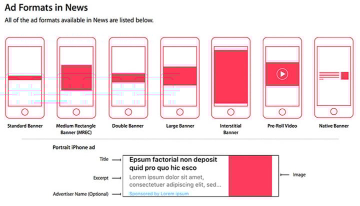 根据 Appleinsider 的报道,苹果在最新的广告规范中详细的列举了内嵌在 news app 的广告形式。这里包括标准的横幅、中等矩形横幅、双横幅、大横幅、空隙横幅、前置视频、本地横幅这个七种形式。