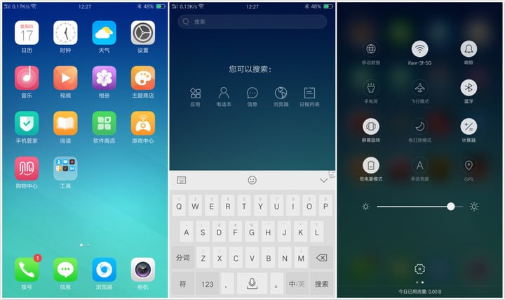 OPPO R9 对于 iPhone 6s 的“致敬”其实更多体现在 UI 上,不管是图标细节,还是整体配色都是满满的 iOS 9 风格。甚至全局搜索的呼出方式也是和 iOS 9 如出一辙。