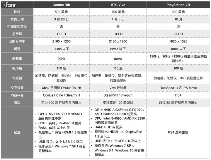 PS VR 消费者版的参数和以前版本基本一致,我们对比了下三大头显: