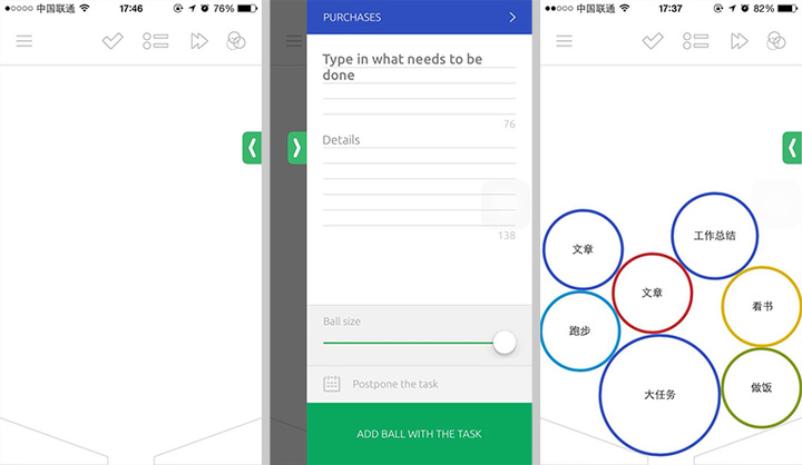 关键点就在于“球”这个概念的设定。因为整个软件的界面是有限的,所以即便你把任务设的再小,同时能够显示的任务也不会太多。而且界面也代表了用户在一定时间内对任务的处理能力。