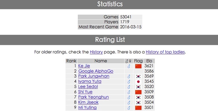 该排行榜每日更新,主要基于 WHR(Whole-History Rating,全史评级)算法,即评估对阵选手在不同时间内实力的一种新方法,其数据由 go4go.net 提供。