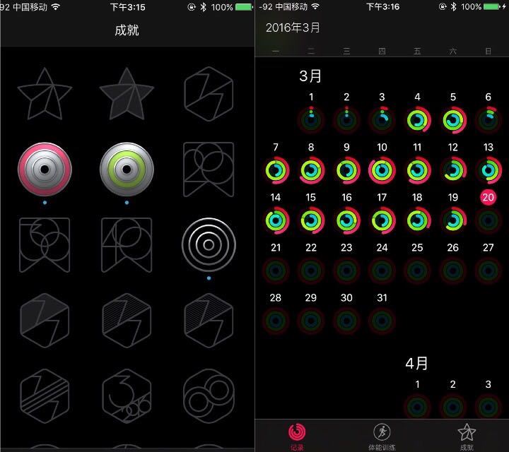 Apple Watch 主打日常健康提醒与运动的成就感。平时一小时一次的站立提醒,告诉长时间坐着写稿的我应该站起来走走,在衡量运动量时每天一圈的标准,也让我有意识的让自己的运动圈尽量走满。通过运动积累徽章的玩儿法对收集控来说非常有吸引力,也间接的吸引我去自觉锻炼。