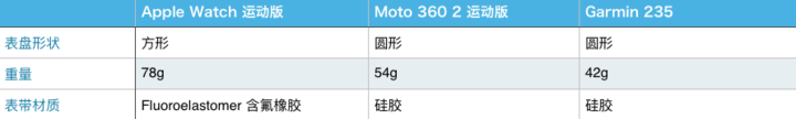 表盘形状、机身重量、表带材质这三个点,能直接关系到一款手表的外观观感和佩戴手感。在 Apple Watch 发布之初有不少人诟病其方形的表盘设计,不过到现在看来,方形的表盘让 Apple Watch 的辨识度极高,能让人一眼认出。而 Moto 360 2代的运动版与 Garmin 235 的圆形表盘使得这两款产品从整体外观上看上去更像是传统的运动手表。