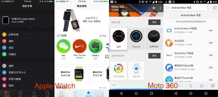 在日常使用的功能上,Apple Watch 最为丰富,App Store 中不少应用都有相应的 Apple Watch 版本。因为我拿到的 Moto 360 2 代运动版为国行版本,应用内容相对较少,但还是可以满足日常使用需要。Garmin 235 只能收到通知但不能回复,但好在续航逆天,在体验的这段时间,不运动的时候,我就把它当做是电子表与通知器的结合来使用。