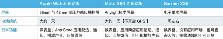作为一名初级入门跑者,兼顾日常使用和运动数据成了我在选择运动智能手表时候的一个基本要求。而在体验了 Apple Watch 运动版,Moto 360 运动版和 Garmin 235 这三款智能手表之后,我有了下面这些体验: