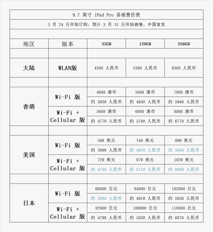 苹果春季发布会一次发布两款硬件产品,可能大家都更关注 iPhone SE 一些,但是我觉得 9.7 英寸的 iPad Pro 或许才是这场发布会的主角。而这一次难得的苹果异常给力,让用户无需久候,仅需一周时间即可购买。既然昨天做了 iPhone SE 的行水对比,那么今天就跟大家在说说 9.7 英寸 iPad Pro 在中、港、美、日之间的差别。