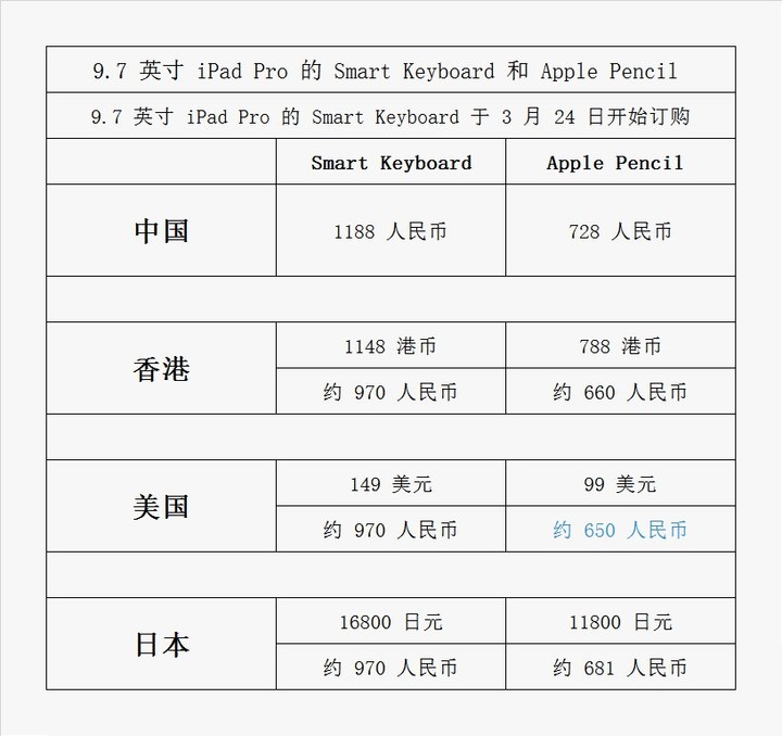 在配件的定价上依旧保持了传统,港美日均要中国区便宜,而 Smart Keyboard 的定价更是可以看出三地几乎没有差别,估计中国区的差价都在税上了,因为三地网上商店标价均是不带税的。