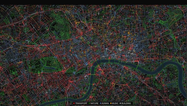 在 Chatty Maps 中,声音被分成了交通、自然、人声、音乐、建筑 5 种类型,并分别用不同的颜色代表。一条街道什么声音为主,就用对应的颜色表示。