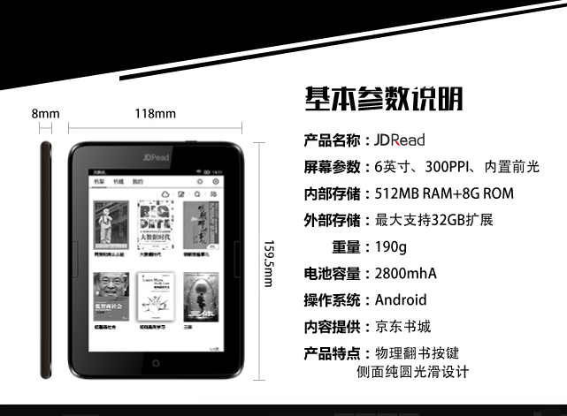 从外观上来看,JDRead 采用了 6 英寸的电子墨显示屏,重量为 190 克,厚度为 8 毫米,整机外观看上去比较像 Kindle Paperwhite 但是尺寸要比 Paperwhite 更小,接近 Kindle 的旗舰产品 Kindle Voyage。重量介于 Paperwhite 的 205 克和 Voyage 的 170 克之间。屏幕尺寸为 6 英寸,分辨率达到了 1440 × 1072,300 PPI。