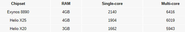 对比三星自家 Exynos 8890 SoC 的 Galaxy S7,Helio X20 在跑分方面是明显落后。