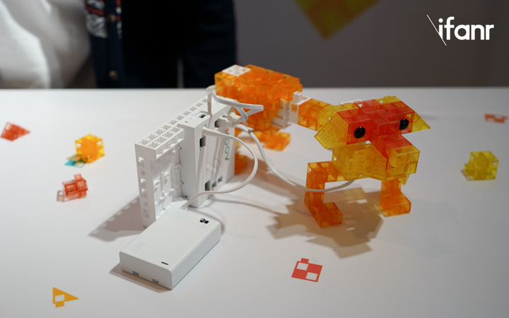 索尼国际教育的展台上亮相了教育套件 KOOV 的概念模型。这款产品主要针对的是儿童。儿童可以利用 KOOV 的七种拼装模块组成任意形状,并可以通过多种控制器和可视化编程语言让自己的机器人变得灵动。