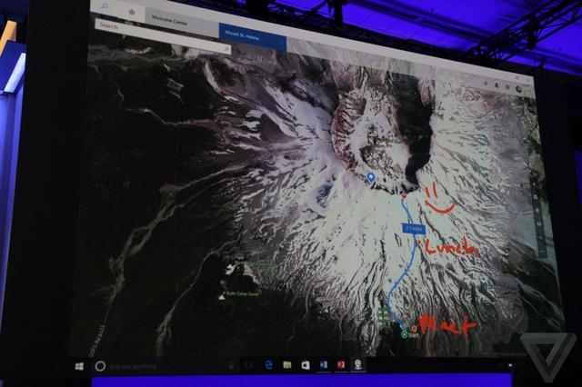 对于笔迹的识别技术也将会运用在地图中,你可以在地图中标出两个点,之后用手写笔连出一条线,Windows 10 系统就将为你计算出这条线所代表的路径的长度。因为是在地图中的运用,两点连线距离的计算将不会是简单的 2 维平面计算,而将会将笔迹适用到 3D 画面中。