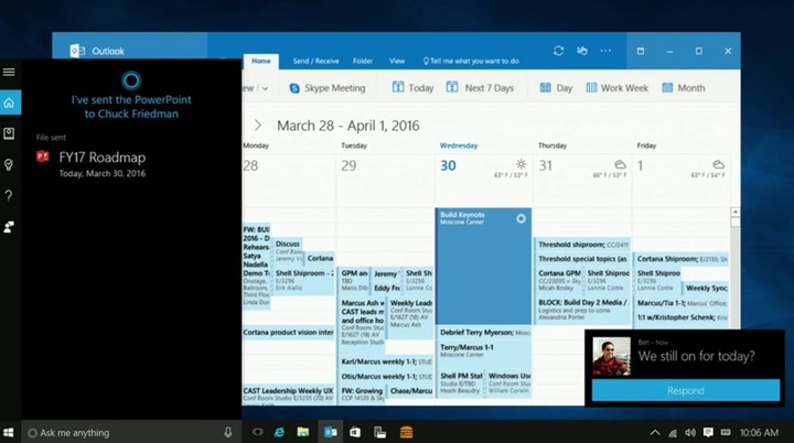 全新的 Cortana 更为强大和宜用,演示中仅凭语音便可让 Cortana 完成搜索文件并发送邮件等一系列操作。