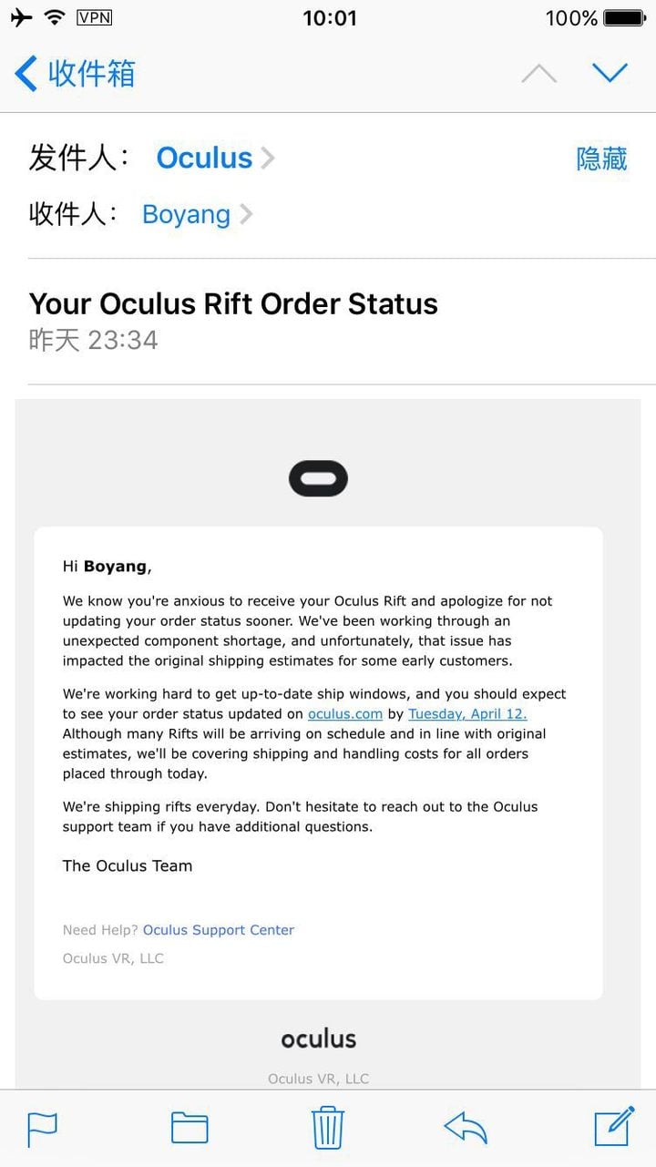然而,Oculus 昨天突然给预订顾客们发了一封邮件: