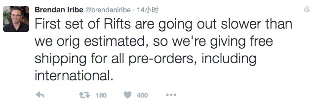 第一批 Oculus Rift 的出货比最初预估的要慢,所以我们取消了所有预订单的运费,包括国际订单。