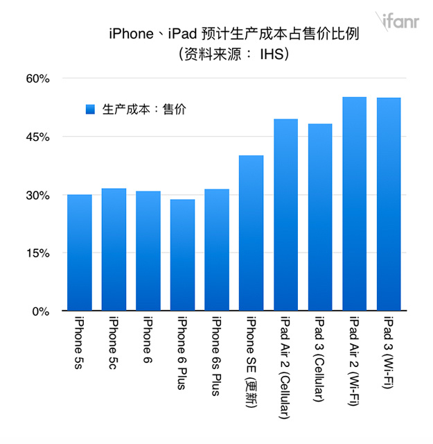 根据 IHS 推断,iPhone SE 的生产成本应该为 160 美元左右,在一众全新推出的 iOS 产品里面算是偏低的(上图)。但考虑到它的价格也是在 iOS 产品当中偏低的一台,所以 iPhone SE 的生产成本占售价比例,其实也是偏高的(下图)。这个比例刚好在 iPhone 和 iPad 之间,算是一个特殊的范畴。