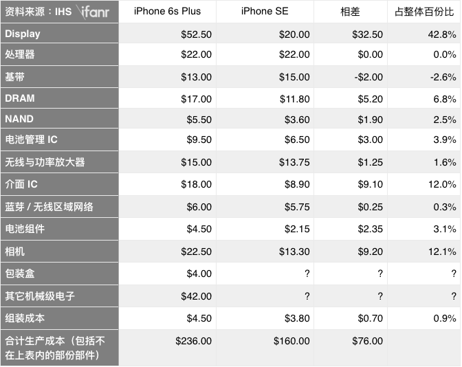 由于 IHS 并没有把所有部件的售价都罗列出来,加上他们的数字本身就带有臆测成份,所以我们并不能准确道出 iPhone SE 成本之谜。但我们能透过不同部件的价格改变(下图),探索当中的一些奥妙。iPhone SE 基本上单是屏幕及相关的介面组件,就让成本降低了接近 30 美元。除此之外,它的相机虽然与 iPhone 6s Plus 规格相似,但在前置镜头不变、以及没有光学防抖的关系,使成本也降低了不少。