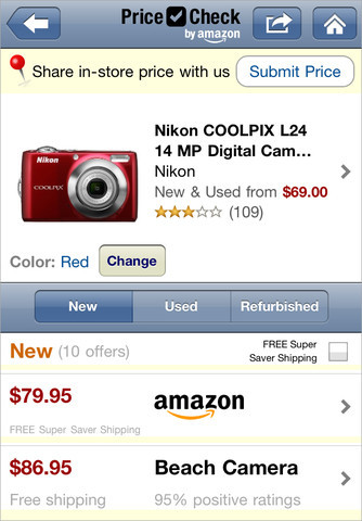 今天亚马逊推出名为 Price Check 的移动比价应用,让用户通过 iPhone、Android 手机到零售店种扫描商品的条形码,然后在亚马逊等网络零售商中找到价格最低的商品。它的使用很简易: