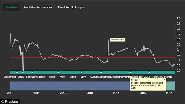 Predata 通过对维基百科、YouTube、Facebook 等网站上的在线活动数据的对比分析。做出类似于天气预报的估算,来提供世界上不同地区发生政治动荡和恐怖袭击的几率。并把不同时间段所对应的几率通过图表的形式呈现出来。