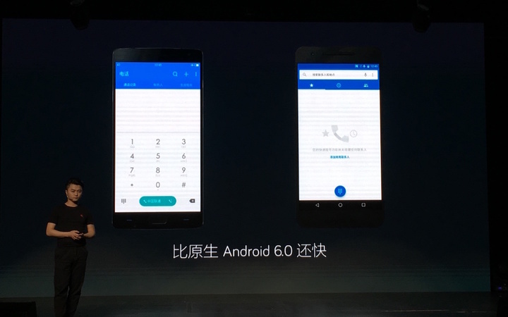 现场一加用更新了氢 OS 1.4 的一加 2 和原生 Android 6.0 的 Nexus 6P 进行对比进入拨号界面的速度,一加也确实更快一些。这些速度提升也让一加表示,氢 OS 1.4 比原生 Android 6.0 还要快。