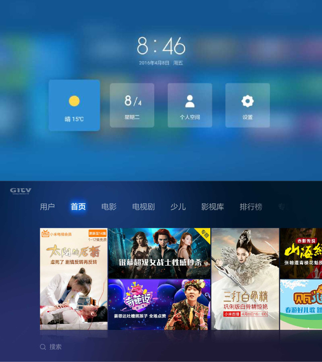 这样的 UI 设计在其他的智能电视上也经常见到,想必这也是智能电视 UI 的范例了。