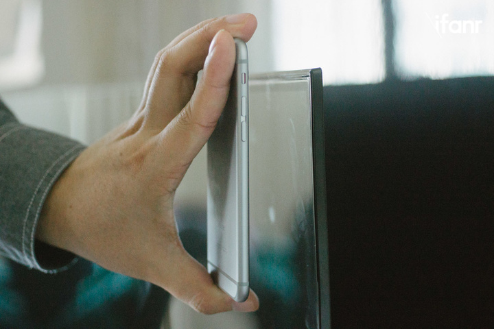 由于电视的主要接口、部件和独立音响系统都位于分体式主机部分,电视屏幕部分仅有一个 MI PORT 接口,电视部分的主要部件只有一块曲面面板,所以屏幕部分的厚度相当喜人,仅有 5.1 毫米,比起 iPhone 6s、或是三星 note 5 要薄上不少。