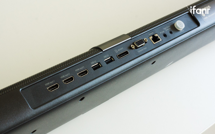 主机部分拥有 3 个 HDMI2.0,1 个 USB3.0,1 个 USB2.0,1 个 MI PORT,1 个 VGA,1 个以太网接口,1 个 AV 接口,1 个音频输出到低音炮接口,1 个模拟信号 DTMB。