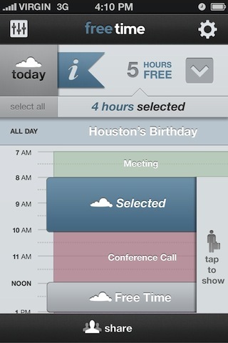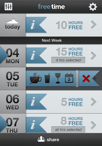 Free-time 是一个帮助用户发现空余时间的日历辅助工具。它能够扫描用户的手机上的日历,抓出那些繁忙事务之间的空闲时间。针对空闲时间长短,它还能自动给出建议,建议你去喝下午茶、或是找朋友吃饭聊天。