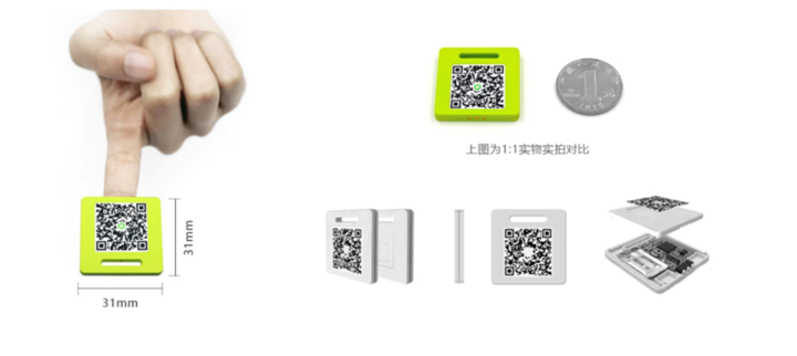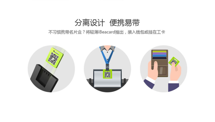 由低功耗 BLE 广播芯片、使用苹果 “Magsafe” 技术的优质充电电路、配以独一无二的二维码构成的 iBeacard 模块,可像积木一样嵌入名片盒体,也可抽出模块独立使用。信标上部留有挂槽,可以吊挂使用;两侧预留插槽,可以插入其他接口组合使用。可以放在钱包、口袋,甚至可以简单的叠加到任何一个我们想得到的生活物品上,给不联网的设备带来“弱联网”的玩法和能力,这样一来大大提高了核心的方便性和适用性。