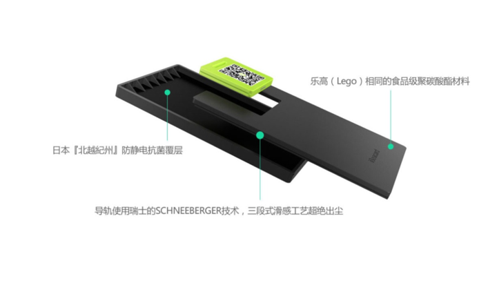 不仅核心模块设计独具匠心,名片盒的处处都彰显着设计者的品味。盒身采用与乐高(LEGO)相同的食品级聚碳酸酯材料,轻薄耐磨之余不失商务稳重感;盒仓内层是来自于日本“北越紀州”的纸张防静电抗菌覆层;盒仓导轨使用瑞士的 SCHNEEBERGER 技术,三段式滑感工艺超绝出尘,比起市面上一般的双导轨名片盒更加浑然天成。