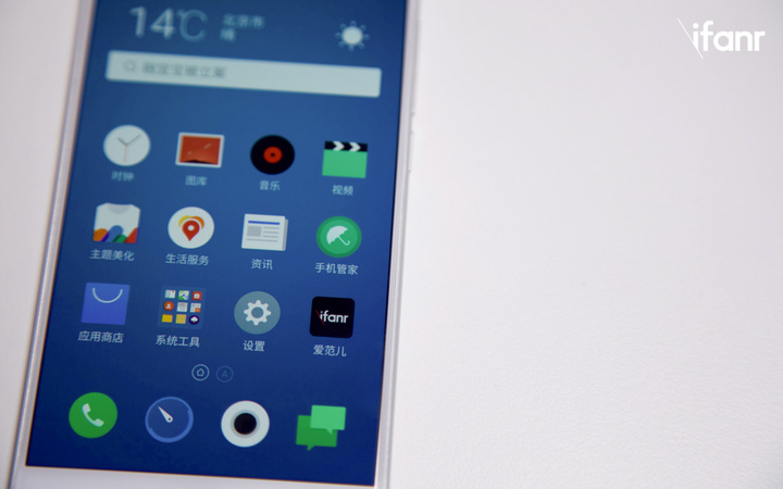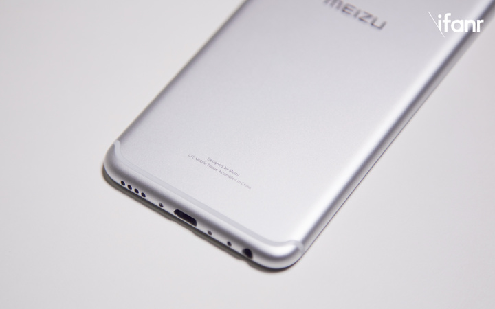 正面采用全对称的设计,5.2 英寸屏幕上部,前置摄像头与传感器对称排列在扬声器两侧,底部是集成了 mBack 功能的指纹识别 Home 键。屏幕采用了 2.5D 弧面玻璃,正面玻璃弧面与后盖的接合处做了金属倒角的处理,让玻璃与金属后盖的接合更加自然。