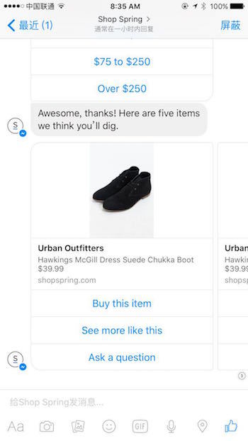 在 Facebook Messenger 上,Bots 的行为确实就好像在跟你聊天一样。以 Shop Spring 为例,添加了它了之后,它会弹出一系列的对话框,供你选择。